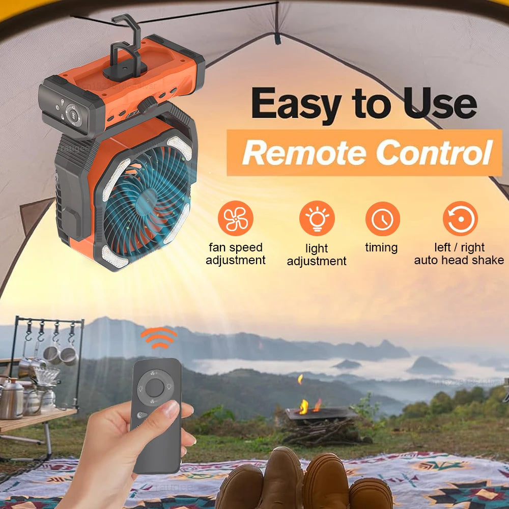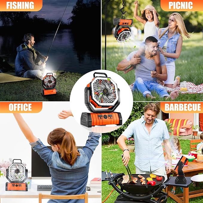 The portable cordless camping fan is equipped with a hook, which can be conveniently hung in the tent or on the camping chair to ensure air circulation. It is also a perfect light source for night camping or hiking.