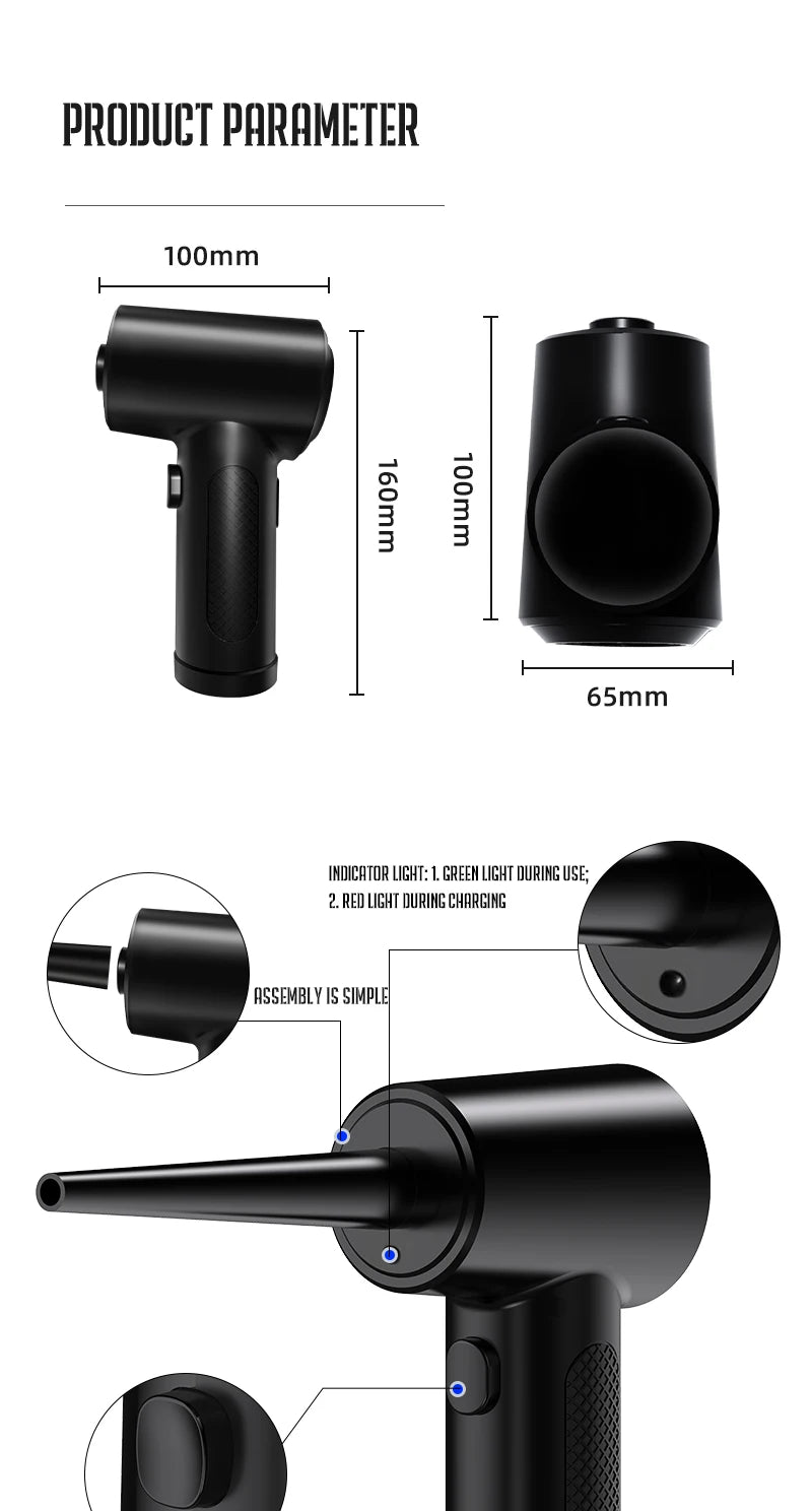 This is a very convenient tool. Charges fast and it lasts a while in between charges. Strong blow. Cleans nicely. Portable and easy to use.