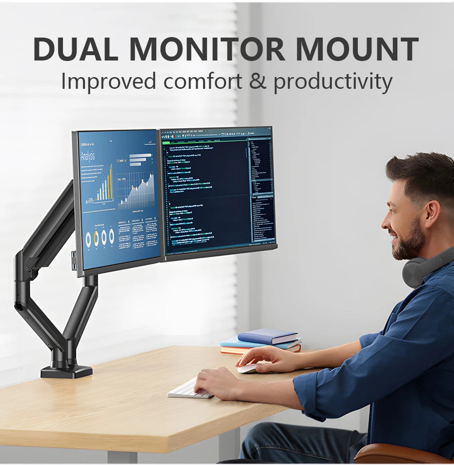 Our dual monitor arm for desk raises monitors to eye level, improving posture, relieving strain on neck & shoulders while increasing productivity levels.Height adjustable, full motion design lets you work in a more comfortable ergonomic position.