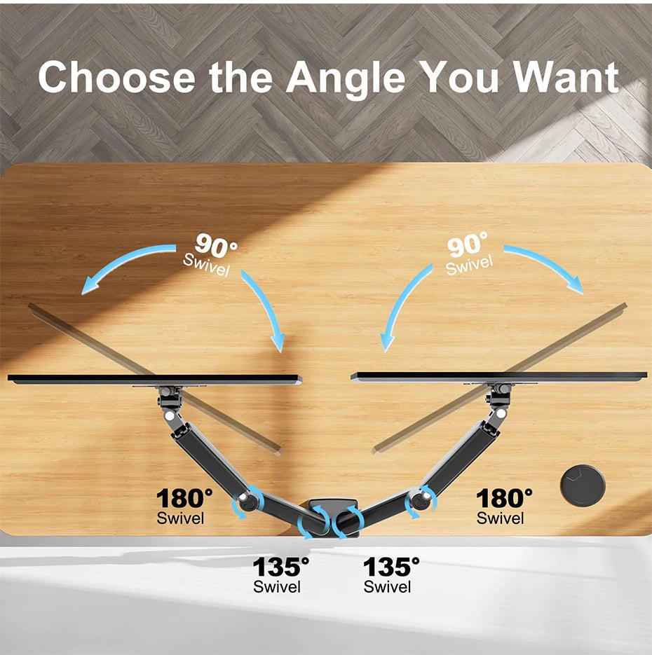 No more bother rotating the angle by adjusting the screw! The gas spring desk arm makes it adjust with such smooth action. The monitor stand allows your monitor to swivel, tilt and rotate. Go and freely set your monitors to customized angle and position.