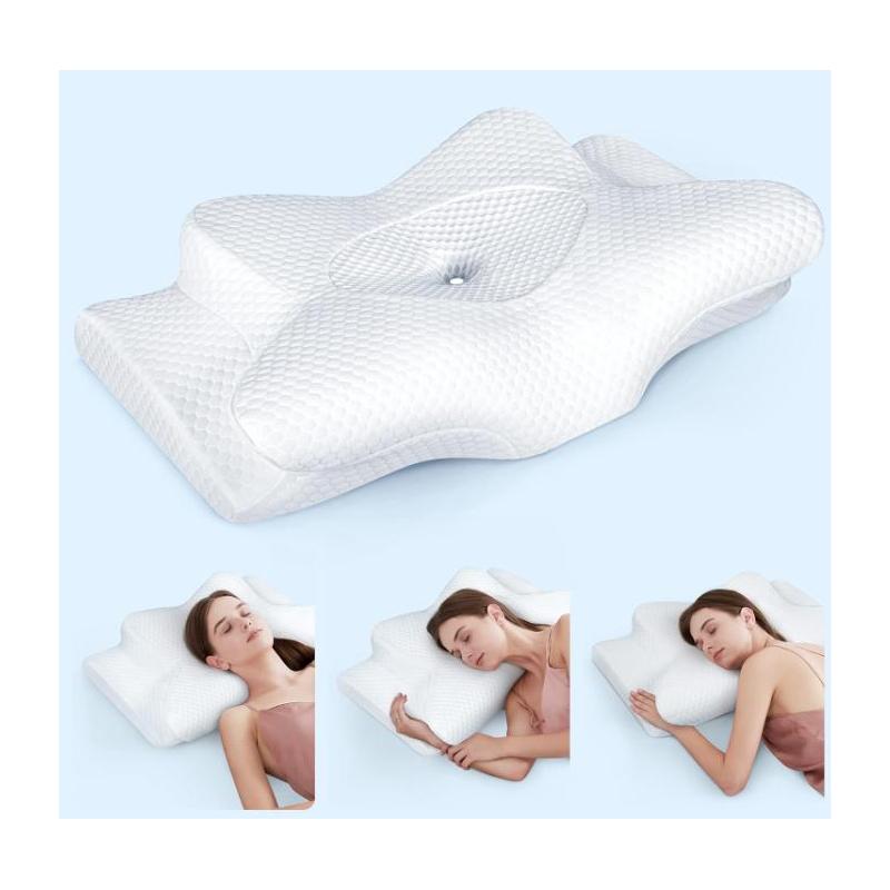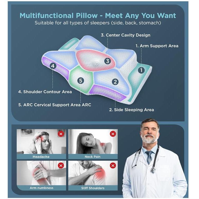 Our pillow has 2 different contour heights on either side, so you can choose whichever works better for your sleep posture. Butterfly design shape gives armrests, no more arms numbness. It offers enough room for your shoulders and makes good nasal airflow for back, side & stomach sleepers. The hole inside was designed to cradle your head for optimal support & reduce the pressure of the skull. It allows for a comfortable yet supportive night's sleep.